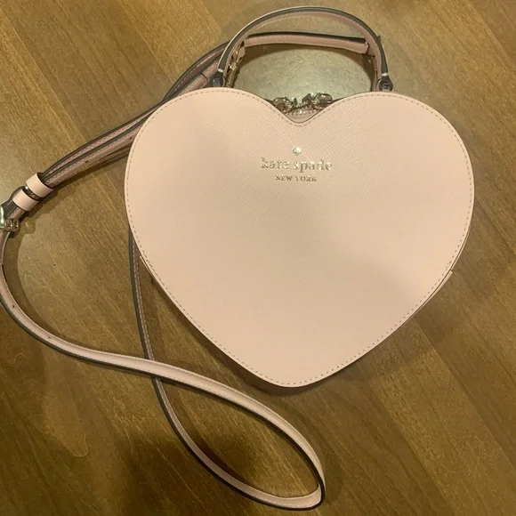 This charming Kate Spade crossbody bag features a unique heart shape in a soft blush pink hue, perfect for adding a touch of whimsy to your ensemble. Crafted with a smooth leather-like finish, it offers a structured design that maintains its playful silhouette. The adjustable strap ensures comfort and versatility for any occasion.